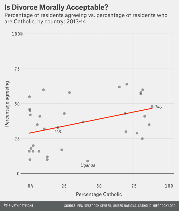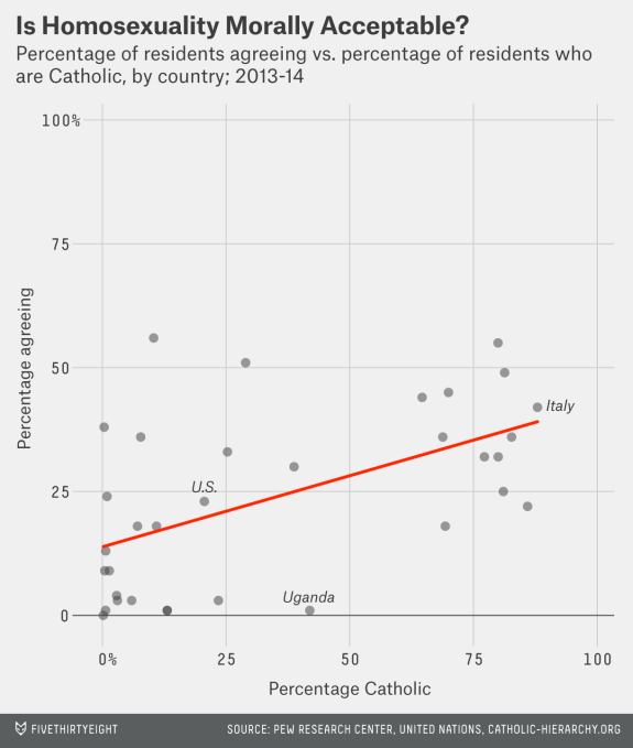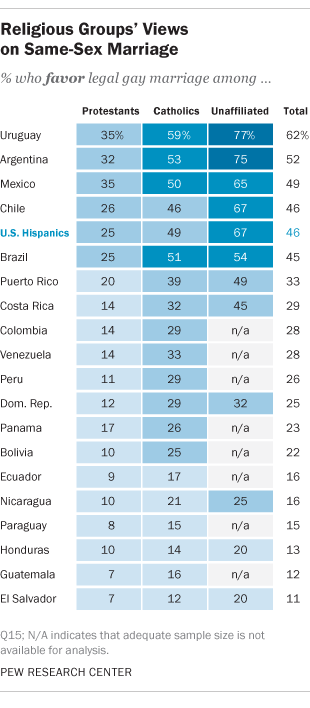 As you can see, the proportion catholic a nation is correlates with these two socially liberal beliefs. This is noticeable even in Latin america where protestants are the minority: